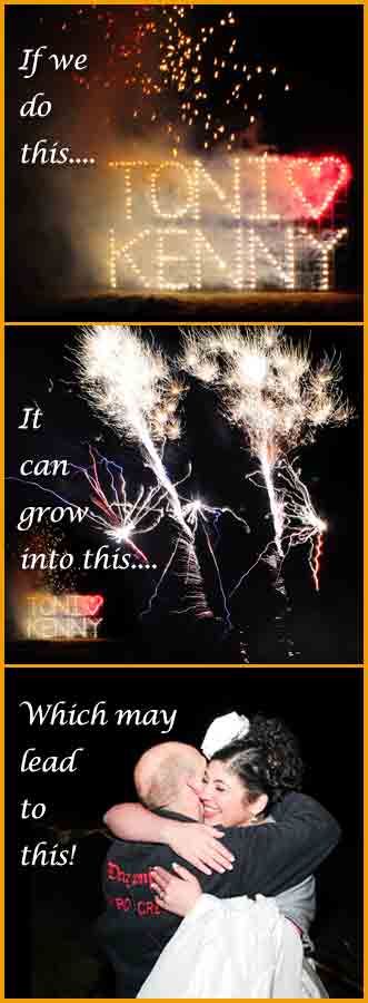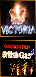 Lances are small cigarette sized tubes of coloured fire. By fusing togther hundreds of lances we can create words or images in coloured flames.